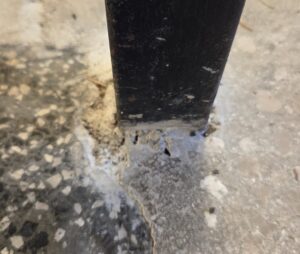 Das nächste Foto zeigt den neuen Terrazzoboden bei der Verankerung des Stiegengeländers. Nach meiner letzten Kritik wurde das ausgebröckelte Steinwerk rund um die Verankerung ausgebessert, aber jetzt, wenige Wochen später, bröckelt es schon wieder aus. Außerdem schaut das weiße Material, das verwendet wurde, nicht schön aus. Das ist der derzeitige Zustand:
