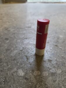In meinen früheren Artikeln habe ich bereits darauf hingewiesen, dass der Boden uneben ist. Mitten im Boden gibt es plötzlich eine abgeschrägte Kante. Man fühlt es, wenn man auftritt. Diese Abschrägung ist schwer zu fotografieren, aber ich hoffe, dass das nächste Foto doch zeigt, dass der Boden abflacht. Ich habe mein Handy mit der unteren Kante auf einen flachen Teil des Bodens aufgesetzt und auf die abgeschrägte Kante eine kleine Tube mit einem Lippenbalsam gestellt. Ich denke, man sieht auf dem Foto schon, dass der Lippenbalsam schräg steht: