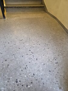 In dem heutigen Artikel geht es nur um die Qualität der Böden, in einem späteren Artikel werde ich beiden Firmen Gelegenheit zu einer Stellungnahme geben. Das Handwerksunternehmen erwähne ich heute nur deshalb namentlich, weil auf der Webseite des Unternehmens Referenz-Fotos von anderen Aufträgen zu sehen sind — und da gibt es ein Foto, das zeigt, dass die Firma mit Terrazzoböden viel Erfahrung hat: Der Link zu dem folgenden Foto einer Sanierungsarbeit zeigt genau die gleiche Art eines Terrazzobodens wie er auch in unserer Liegenschaft existiert. Es sollte also meiner Meinung nach zumindest technisch bzw. handwerklich möglich sein, dass auch die Terrazzoböden in “meiner” Liegenschaft so saniert werden, dass sie nach der Sanierung annähernd wieder so ausschauen wie in den 1960er Jahren.